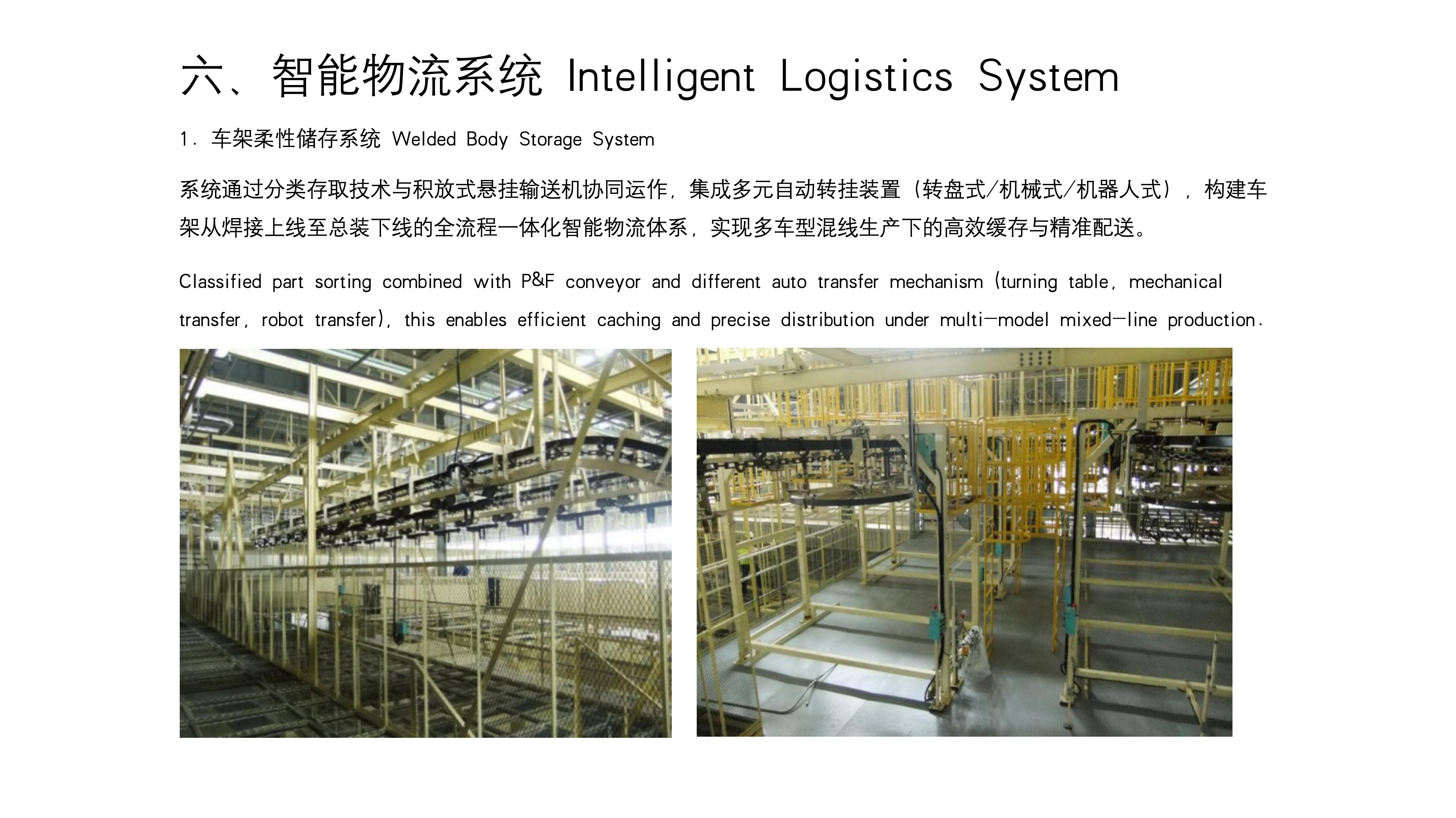 Welded Bod Classified part sorting combined with P&F conveyor and different auto transfer mechanism (turning table, mechanical transfer, robot transfer), this enables efficient caching and precise distribution under multi-model mixed-line production.