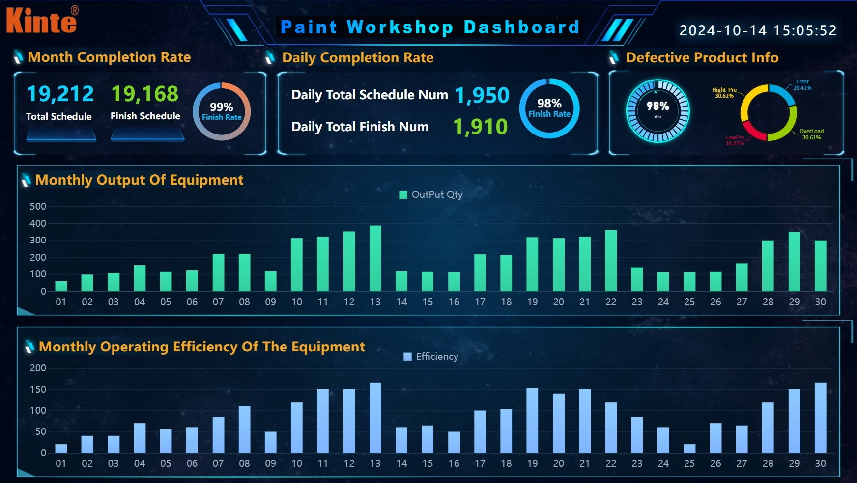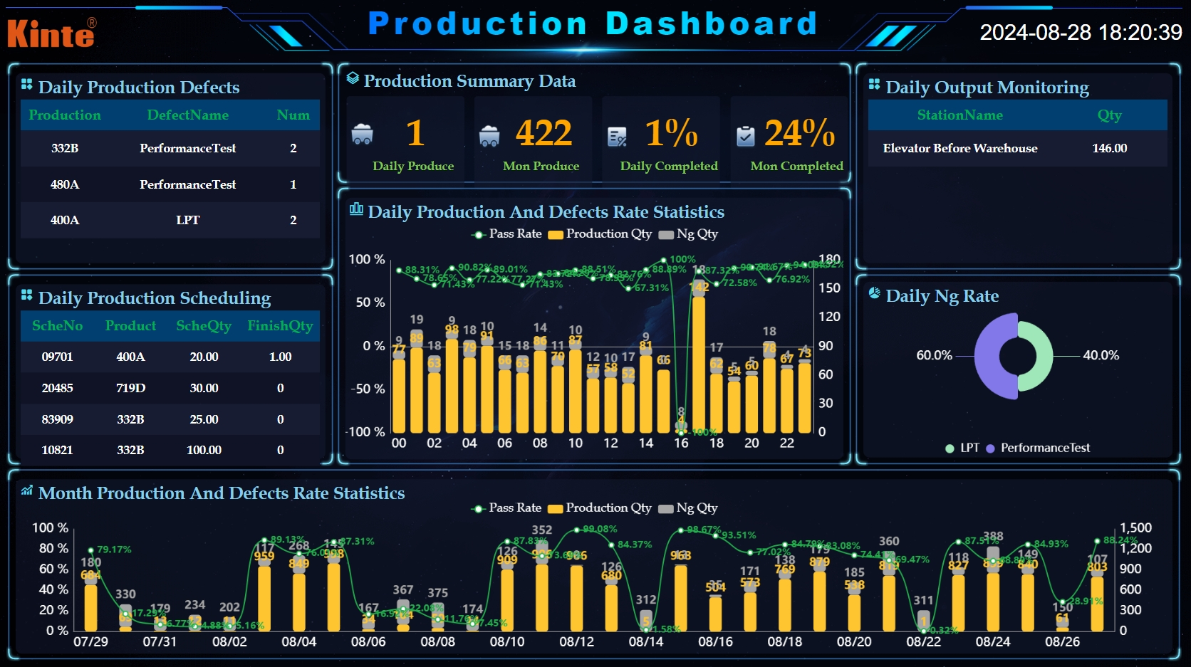 The data display and analysis module converts the real-time core data such as production volume, production yield, process traceability, abnormal list, and production dashboard, enabling a clear understanding of the real-time status of the production site. It offers real-time data monitoring and visualization, optimization of resource allocation, process traceability, and promotion of production collaboration.